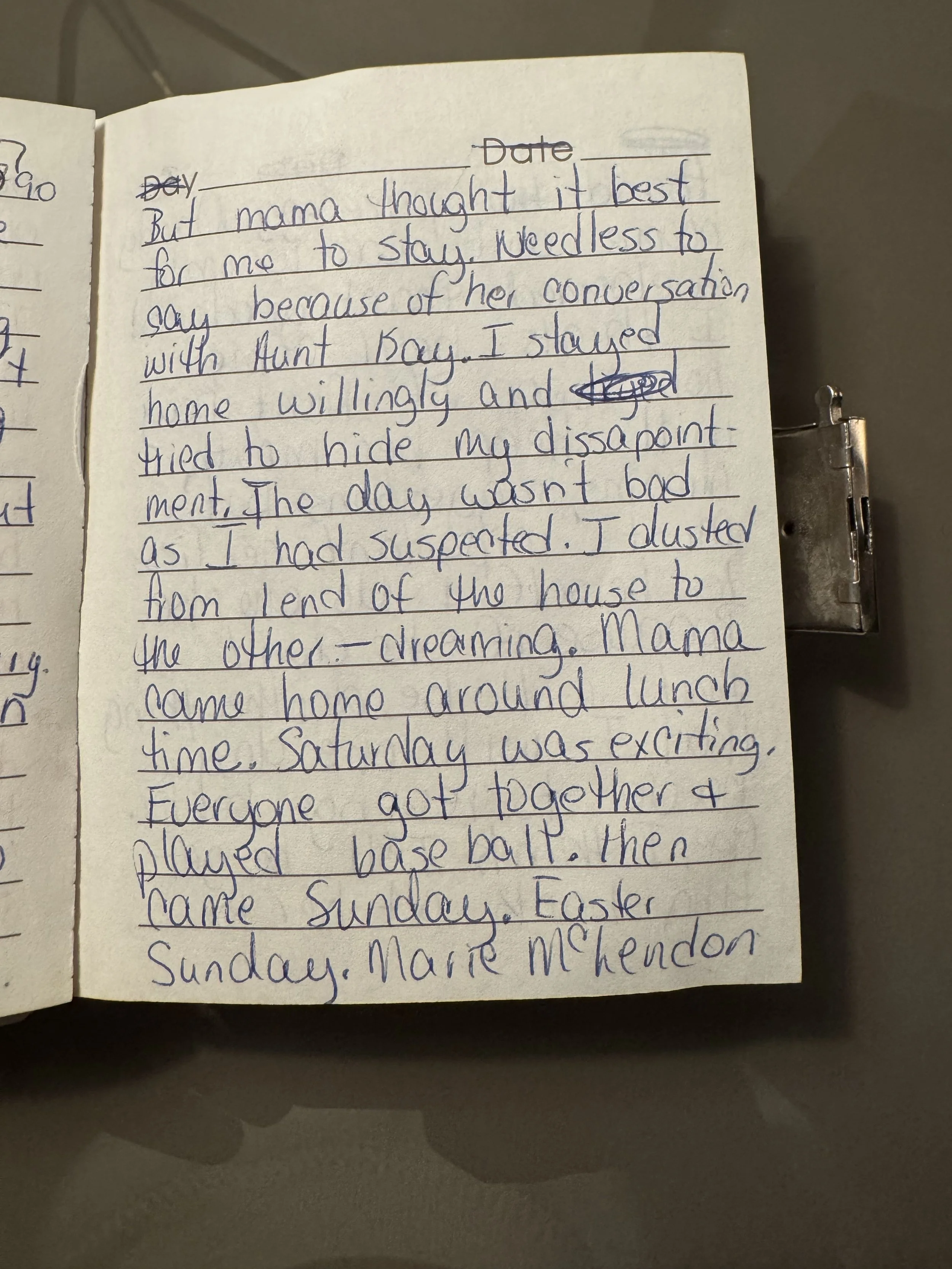 Then came Friday, the day I had dreamed of for so long. I was “supposed” to go with Aunt Beckie to her school and egg hunt. But Mama thought it best for me to stay [home]. Needless to say, because of her conversation with Aunt Kay. I stayed home willingly and tried to hide my disappointment.